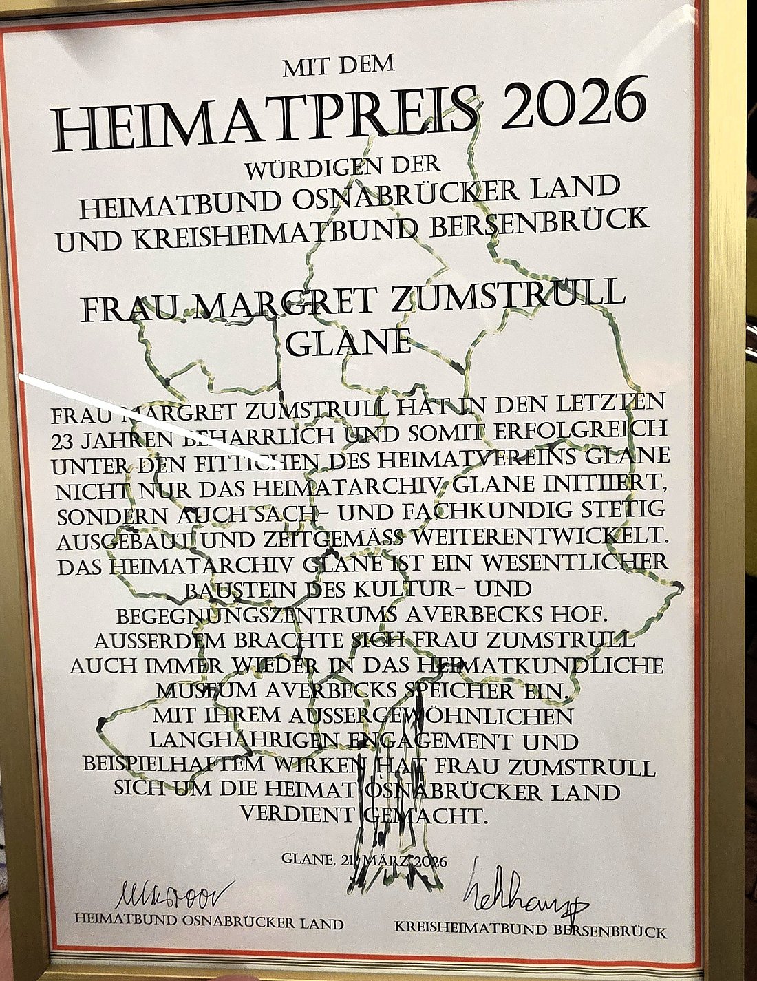 Der Heimatbund Osnabrücker Land und der Kreisheimatbund Bersenbrück ehrten Die Preisträgerin Margret Zumstrull mit der Verleihung des Heimatpreises 2026. Am Samstag, 21. März fand in Glane in Averbecks Hof die feierliche Preisverleihung statt.
